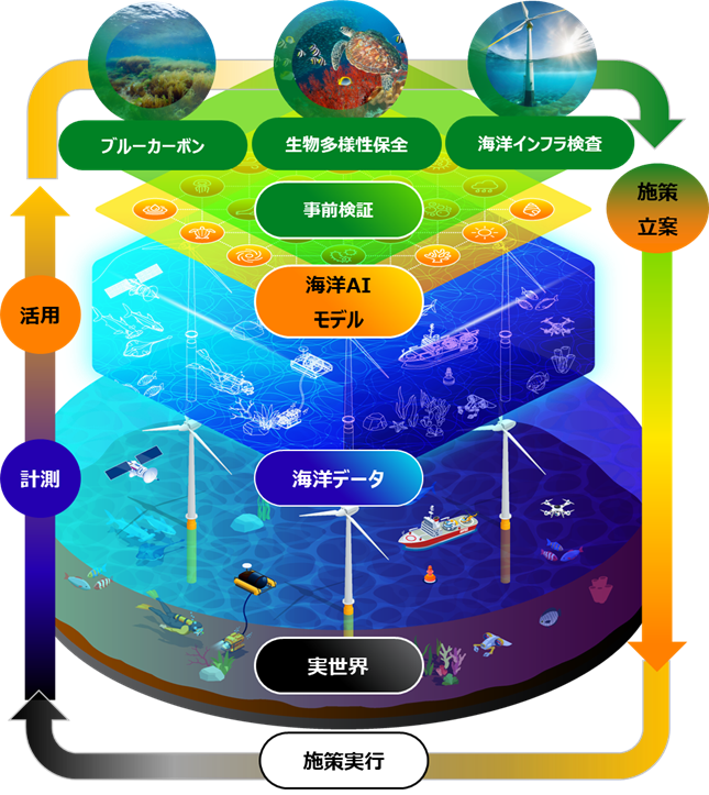 海洋状態のデジタル化・定量化とシミュレーションによる施策の事前検証で、海洋環境の改善施策立案から効果検証までのサイクルを効率化し、ネイチャーポジティブを実現します。